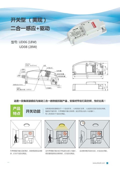 | 開關(guān)型 (美規(guī)) 二合一感應(yīng) + 驅(qū)動UD06 (18W) / UD08 (28W) | |