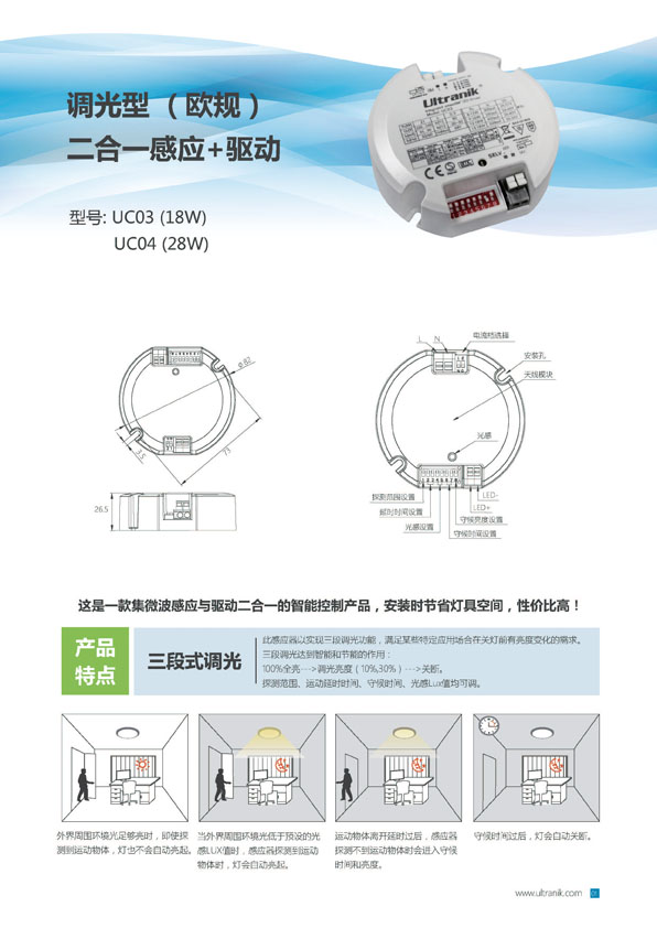 | 調(diào)光型 (歐規(guī)) 二合一感應(yīng) + 驅(qū)動(dòng) UC03(16W)/ UC04 (28W) | |