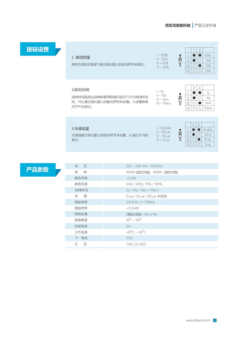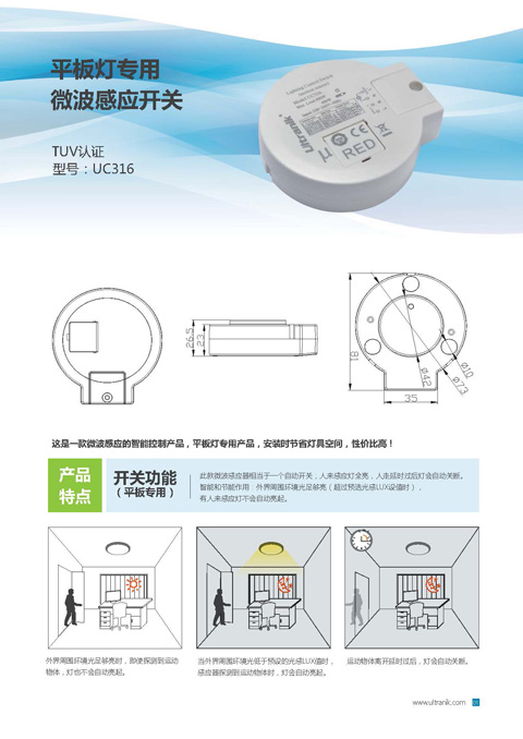 緊湊型微波感應(yīng)開關(guān)UC316 技術(shù)參數(shù) 電壓 220 ~ 240VAC 50/60Hz 功率 400W(容性負(fù)載) 800W(阻性負(fù)載) 靜態(tài)功耗 <0.3W 探測范圍