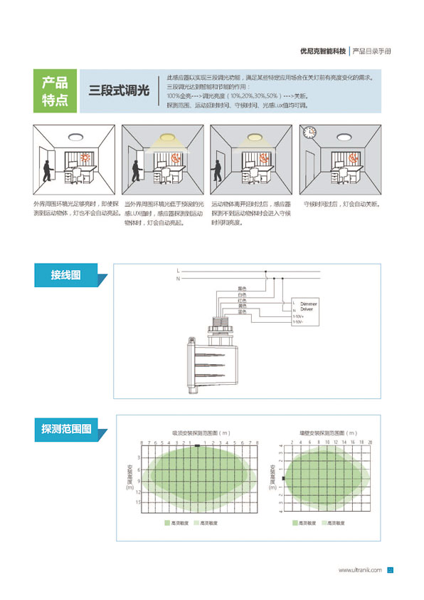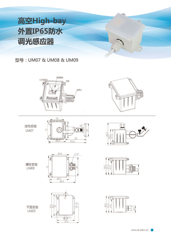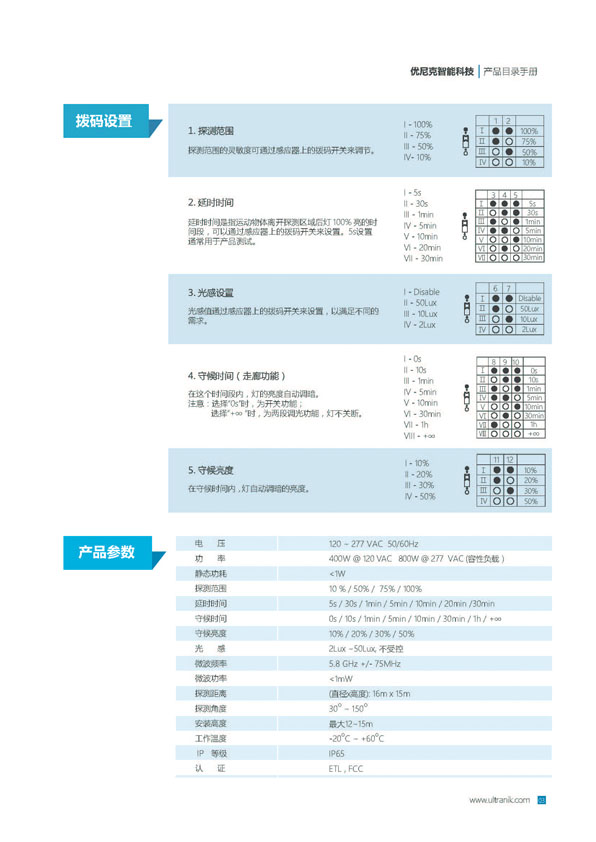 UM07掛鉤安裝/ UM08 螺栓安裝/ UM09平面安裝 技術(shù)參數(shù) 電壓 120 ~ 227VAC 50/60Hz 功率 400W@120V 800W@270V(容性負(fù)載) 靜態(tài)功耗 <1W 探測(cè)范圍
