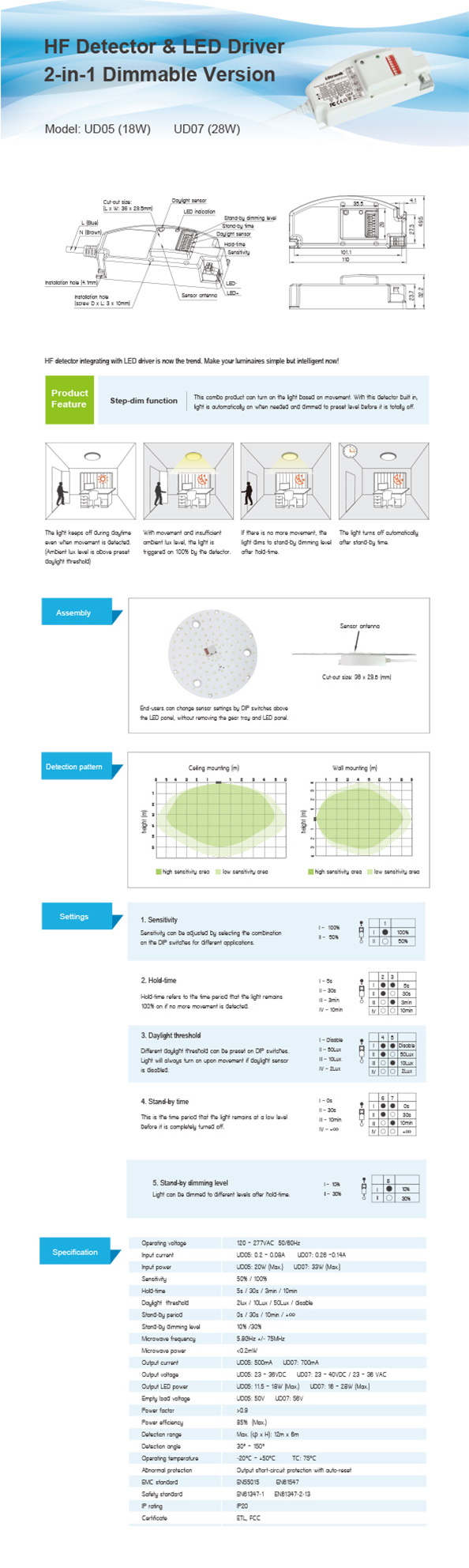 | Output LED power: | UD05: 11.5 ~ 18W (Max.) UD07: 16 ~ 28W (Max.) |