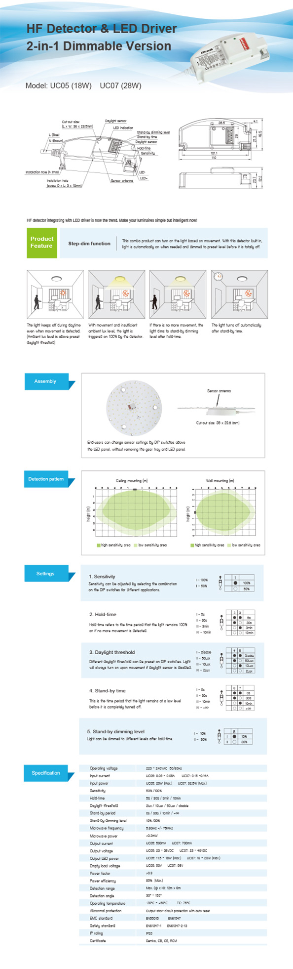 | Output LED power: | UC05: 11.5 ~ 18W (Max.) UC07: 16 ~ 28W (Max.) |