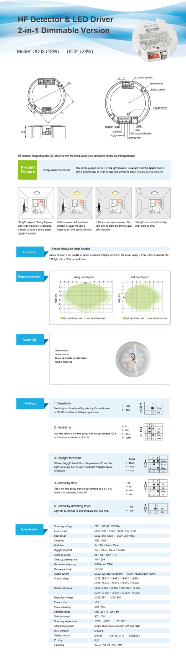 | Output LED power: | UC03: 8-15W / 10-16W / 12.5-18W / 14-18W UC04: 10-19W / 12-23W / 13-25W / 15-28W |