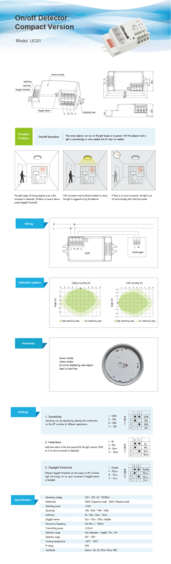 | Daylight sensor: | 2lux / 10lux / 50lux, disable |