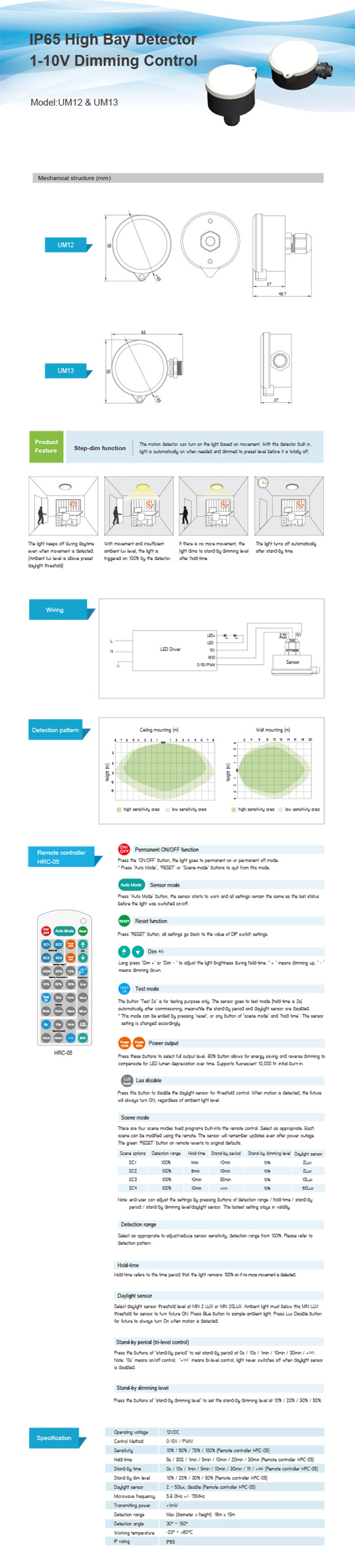 | Stand-by dim level: | 10% / 20% / 30% / 50% (Remote controller HRC-05) |